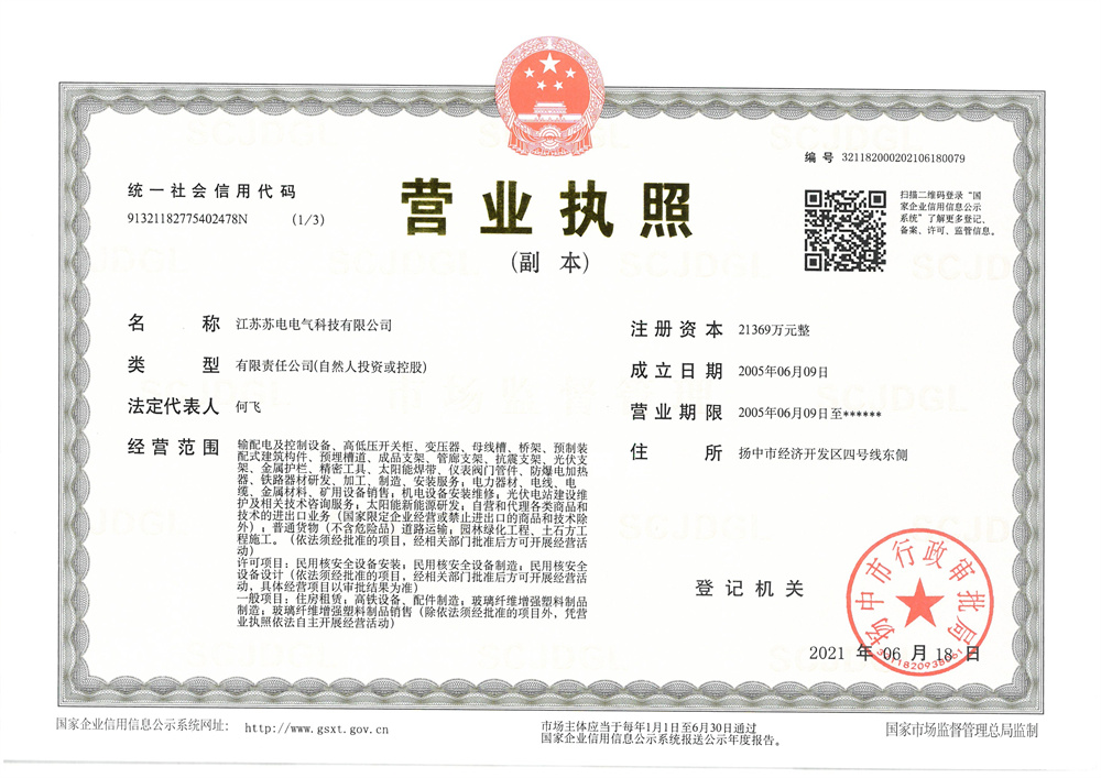 江蘇蘇電電氣科技有限公司是一家集制造、經(jīng)營、服務(wù)于一體的綜合性企業(yè)。成立于2005年6月9日,注冊資金21369萬元,現(xiàn)有職工186人,其中高級工程師3人 ,工程師15人,各類專業(yè)技術(shù)人員28人,年銷售額3億多,是揚中市開發(fā)區(qū)三十強企業(yè)之一。 公司立足于電器領(lǐng)域,形成了多元化的發(fā)展格局。憑借優(yōu)秀的團隊、精良的設(shè)備、優(yōu)勢的技術(shù)和高效的管理,專業(yè)生產(chǎn)高低壓開關(guān)柜、母線槽、抗震支架、管廊支架、成品支架、光伏支架、電纜橋架等。在供配電、大型建筑、市政工程、光伏發(fā)電等領(lǐng)域享有較有高的聲譽。 公司始終秉承“求實、創(chuàng)新、和諧、共贏”的發(fā)展主題,進(jìn)行了一系列變革,優(yōu)化資源配置,搭建了高效發(fā)展的平臺。公司較早地采用了CAD電腦輔助系統(tǒng),擁有數(shù)控加工中心。產(chǎn)品被青島新機場、江蘇省電力公司、湖北省電... ...